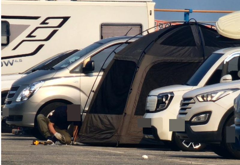 공개된 사진에는 주차장 한쪽에서 모자를 착용한 한 남성이 커다란 텐트를 치고 드릴로 아스팔트 바닥에 구멍을 내며 텐트를 고정하는 모습이 담겼다.