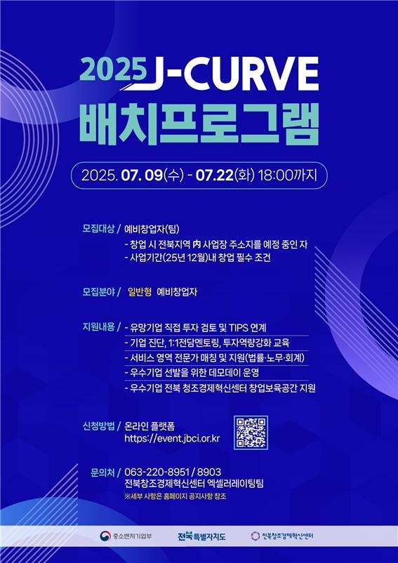 [전주=뉴시스] 김민수 기자 = 전북창조경제혁신센터가 우수한 아이디어를 보유한 (예비)창업자 및 초기 창업기업을 발굴해 집중 육성하는 '제이 커브(J-curve) 배치프로그램' 4기 참여기업을 모집한다고 11일 밝혔다.