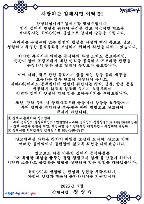 [김제=뉴시스]고석중 기자 = 전북자치도 김제시는 2024~2025년 300만원 이상 보조금 수혜자 353명과 5000만원 이상 계약자 345명 등 총 698명을 대상으로 '청렴 서한문'을 발송했다고 11일 밝혔다.