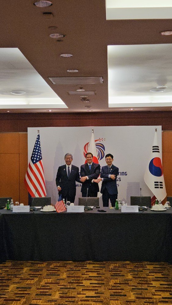 한미일 3국은 현지시간으로 이날 오전 10시 쿠알라룸푸르 컨벤션센터에서 박윤주 외교부 1차관, 마코 루비오 미국 국무장관, 이와야 다케시 일본 외무상이 참석한 가운데 한미일 외교장관 회의를 가졌다.