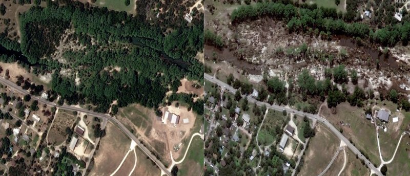 9일(현지시간) 미국 CBS뉴스 등 외신은 홍수 피해를 입은 텍사스주 커 카운티의 헌트와 커빌 지역의 위성 사진을 공유했다.