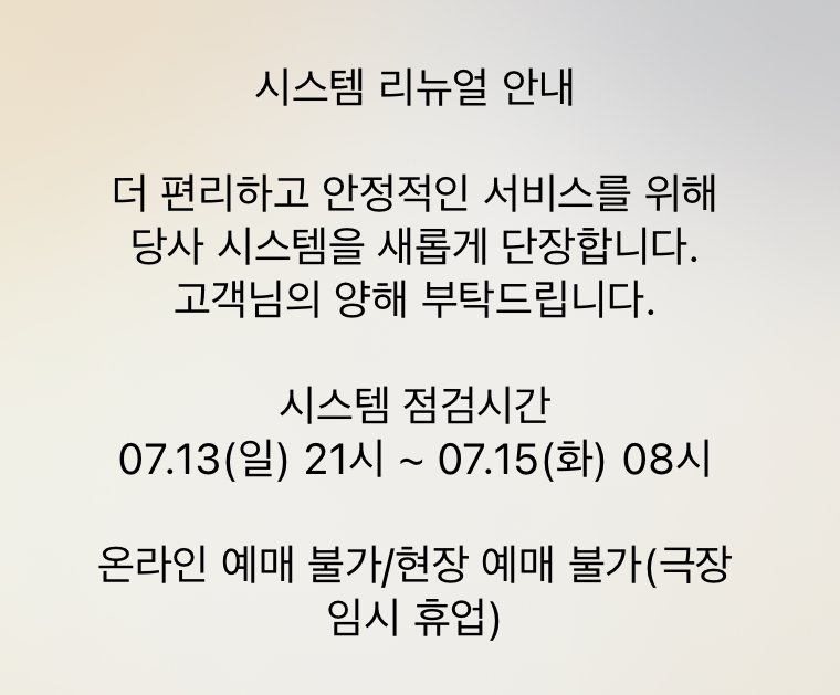 CGV는 이같은 내용을 공지하고 "더 편리하고 안정적인 서비스를 위해 당사 시스템을 새롭게 단장한다"며 "서비스 이용이 일시 중단되오니 이용에 참고 부탁한다"고 말했다.