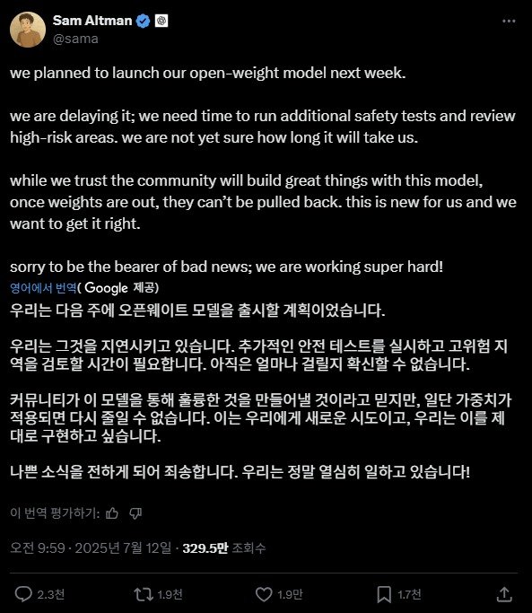 이어 "모델 출시 후엔 가중치 등을 회수할 수 없기 때문에 신중을 기하고 있다며 "나쁜 소식을 전해 죄송하다. 우리는 정말 열심히 일하고 있다"고 전했다.