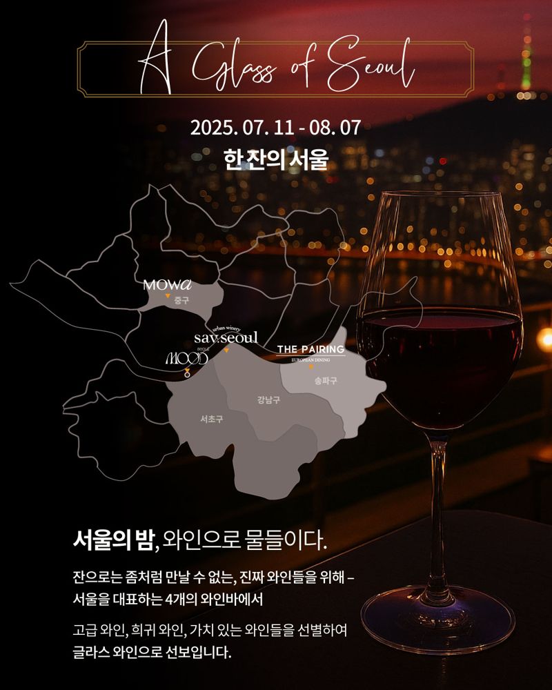 한 잔의 서울 캠페인은 7월 11일부터 4주간에 걸쳐 순차적으로 진행된다. 4가지 큐레이션 테마에 따라 총 25종의 프리미엄 와인이 글라스로 제공된다. 와인 구성은 병 단위로만 만나보기 어려운 프리미엄급 와인을 중심으로 엄선됐다.