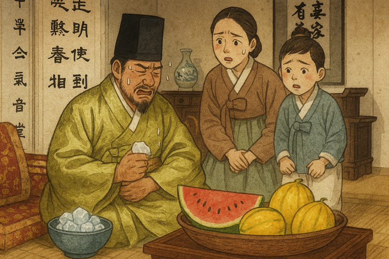 그러나 대감은 “내가 죽는 한이 있어도 이 더위에 얼음을 참으라니! 그 귀한 얼음이 녹는 것을 보고만 있으랴? 더워 죽겠으니 어서 얼음과 시원한 수박이나 참외 같은 과일들을 함께 들라.”라며 일축했다.