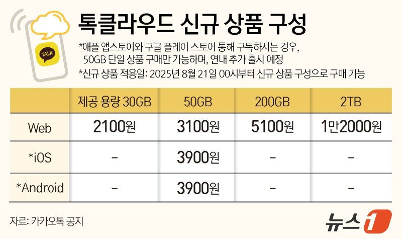 8월 21일부터 적용되는 새 구독료는 △30GB 2100원 △50GB 3100원 △200GB 5100원 △2TB 1만2000원 등으로 바뀐다.