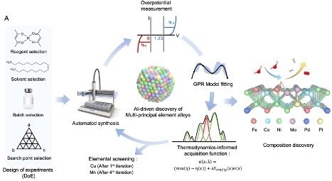 연구팀은 다원소의 조성 공간에서 한 원소의 과전압에 대한 기여도를 독립적으로 확인할 수 있는 AI 모델을 구축, 이를 기반으로 최적의 조성을 가진 촉매를 찾을 수 있도록 설계했다.