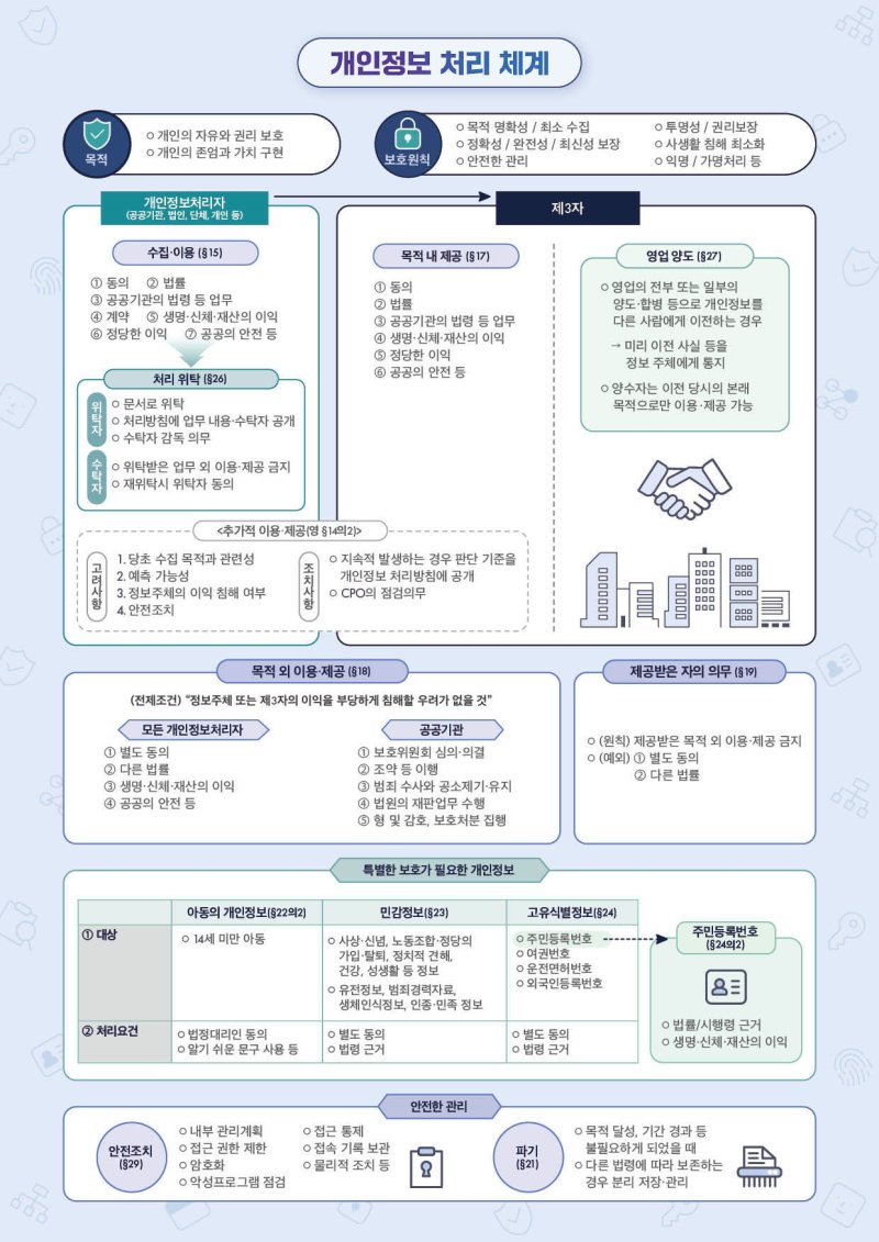 통합 안내서에는 ▲개인정보 처리 체계 개편사항 ▲필수동의 방식의 고지방식 전환 ▲자유로운 의사에 따른 동의 방법 ▲대규모 수탁자와 위탁자 간 관리·감독 방식 ▲영업양도에 따른 이전 제한 ▲개인정보를 제공받은 자의 의무 등을 담았다.