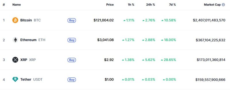 다른 암호화폐도 일제히 랠리하고 있다. 시총 2위 이더리움은 2.88% 상승한 3041달러에 거래되고 있다.
