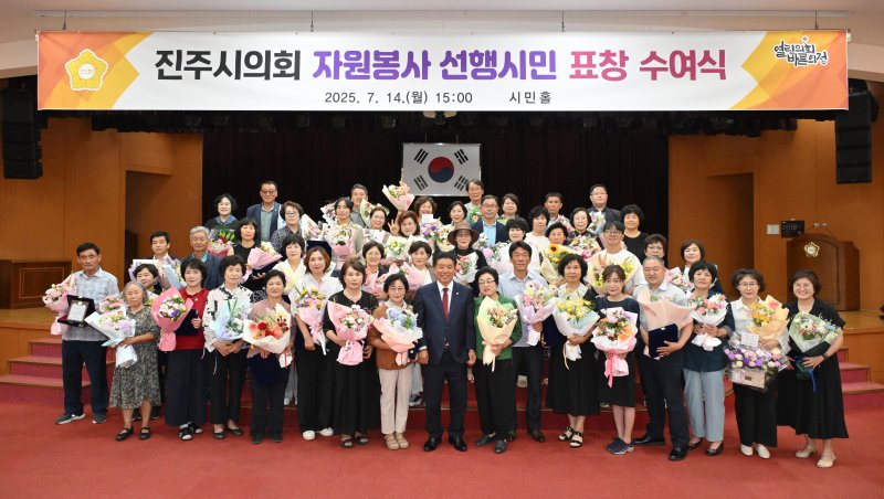 [진주=뉴시스] 정경규 기자 = 경남 진주시의회는 14일 진주시청 시민홀에서 ‘2025년 상반기 자원봉사 선행 시민 표창 수여식’을 개최해 지역사회 발전과 나눔문화 확산에 기여한 시민 60명에게 감사의 뜻을 표했다.
