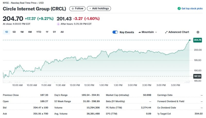 일단 서클은 9.27% 폭등한 204.70달러를 기록했다. 이로써 시총도 500억달러를 돌파했다.