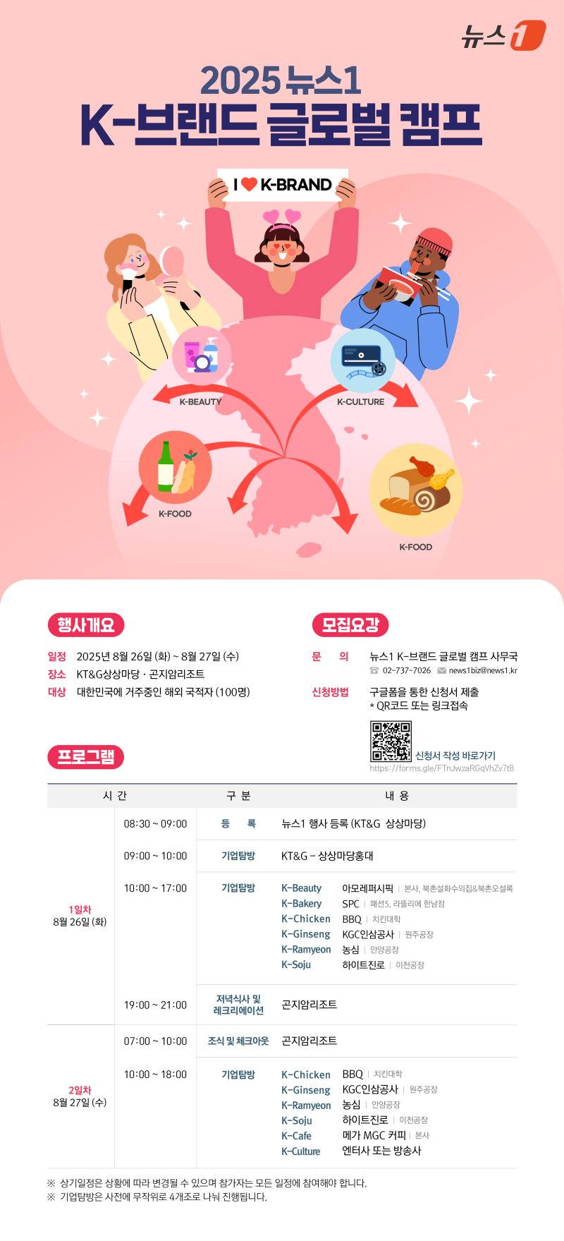 민영뉴스통신사 뉴스1은 8월 26일부터 27일까지 K-브랜드 글로벌 프로젝트의 일환으로 국내 거주 외국인을 대상으로 'K-브랜드 글로벌 캠프'를 개최합니다.