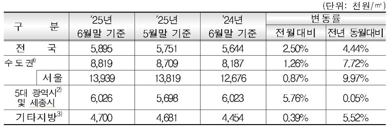 서울은 ㎡당 평균 1393만9000원으로 전국 최고 수준을 기록했다. 전년 동월과 비교해서는 9.97% 상승했다.