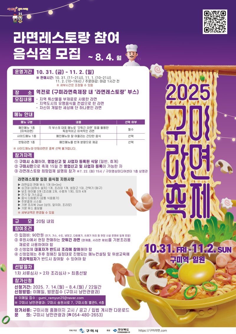 (구미=뉴스1) 정우용 기자 = 경북 구미시는 10월31일부터 11월2일까지 열리는 '구미 라면축제'에 참가할 음식점과 셰프를 공개 모집한다.