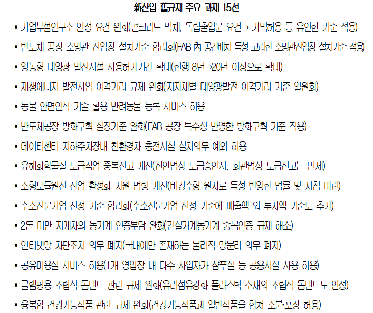 대한상의는 이밖에도 반도체공장 방화구획 설정기준 완화, 소형모듈원전 산업 활성화 지원 법령 개선, 글램핑용 조립식 돔텐트 관련 규제 완화 등 신산업을 가로막는 구시대적 규제 등을 포함, 50여건을 건의서에 담았다. 대한상의 관계자는 "새로운 시도나 산업에 대해 열린 규제로 다양한 성장 원천을 만들어내야 한다"고 강조했다. kjh0109@fnnews.com 권준호 기자