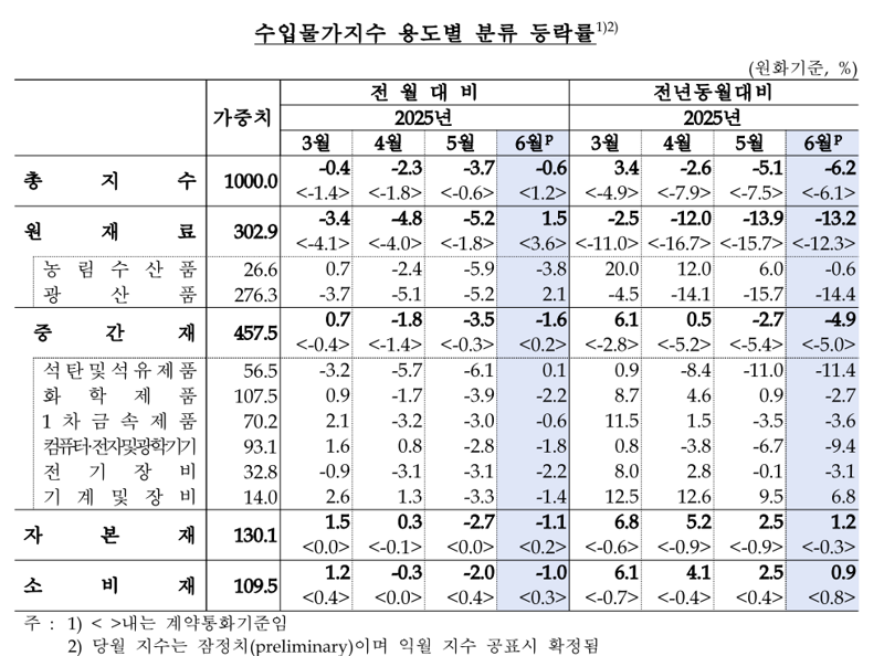 16일 한국은행이 발표한 '2025년 6월 수출입물가지수 및 무역지수'에 따르면 지난달 수입물가지수는 전월 대비 0.6% 하락하며 5개월 연속 하락했다. 전년 동월 대비로는 6.2% 떨어졌다.