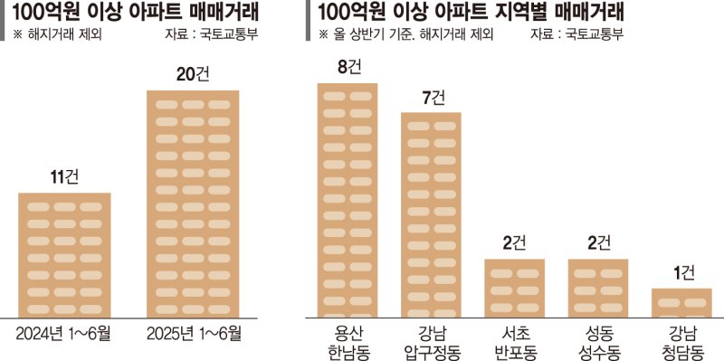 15일 파이낸셜뉴스가 국토교통부 실거래가 자료를 분석한 결과 올 상반기 100억원이 넘는 아파트 매매거래(계약해지 제외)가 이날 기준으로 총 20건 체결된 것으로 조사됐다. 이는 반기 기준으로 역대 최고치이다. 국토부 자료를 보면 1~6월 기준으로 종전 최고 기록은 지난해로 11건이었다.