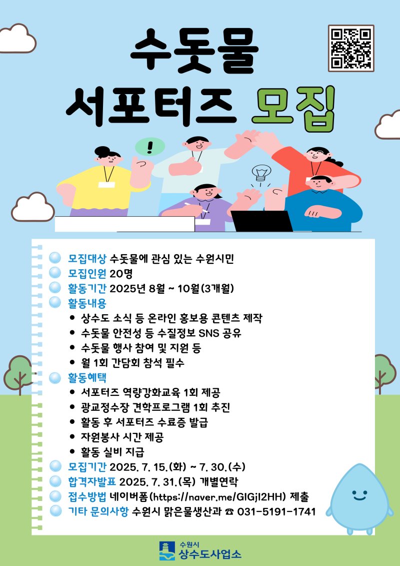 신청은 15일부터 30일까지 네이버폼을 통해 접수하며, 합격자는 31일 개별 연락을 통해 발표한다. 자세한 사항은 수원시상수도사업소 맑은물생산과로 문의하면 된다.