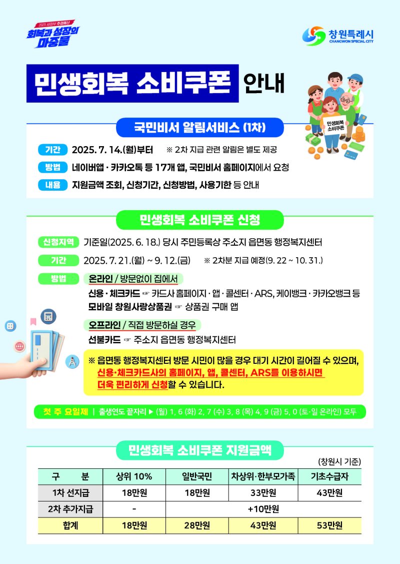 창원시의 경우 1차 지급은 7월21일부터 9월12일까지 진행되며 일반시민은 18만원, 차상위계층·한부모가족은 33만원, 기초생활수급자는 43만원이 지급된다.