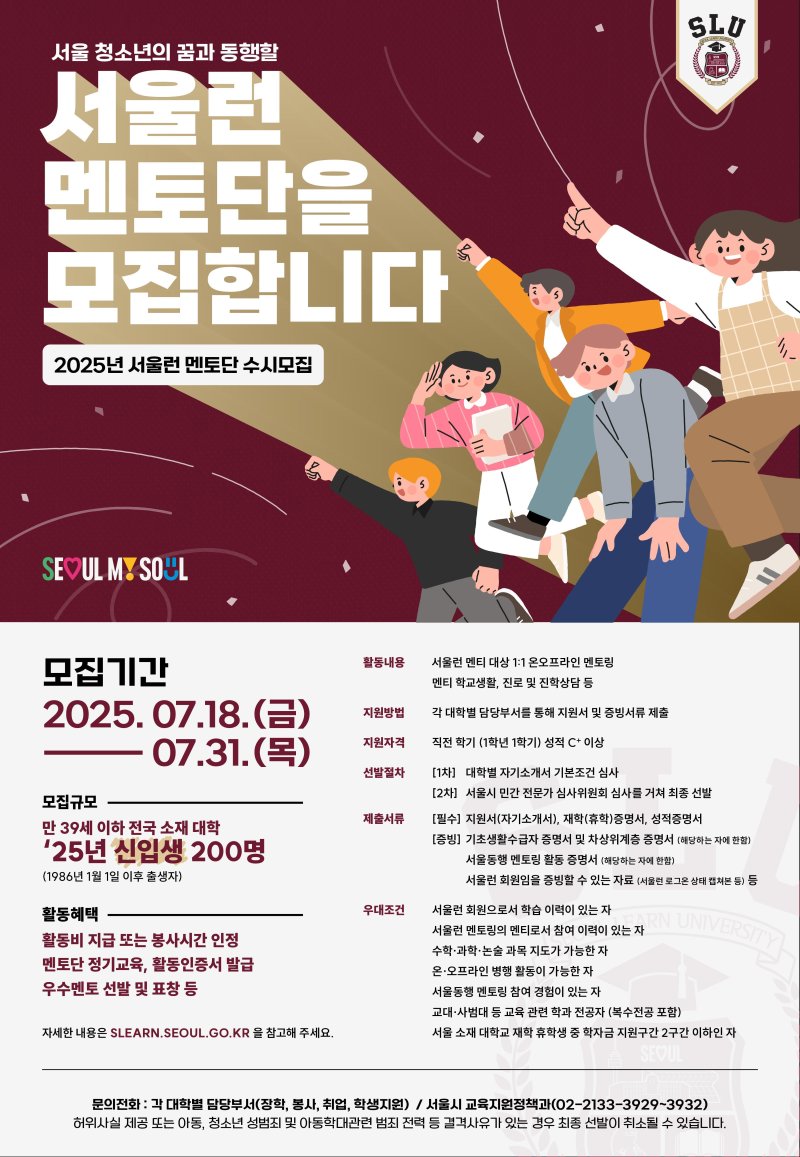 서울런 멘토단은 중·고등학생 멘티가 서울런 플랫폼의 학습 콘텐츠를 체계적으로 활용할 수 있도록 돕는 '학습 코치' 역할을 한다. 특히 이번 수시모집에서는 처음으로 대학 신입생을 선발, 입시 직후 경험에서 우러난 조언을 통해 멘토링 효과를 한층 높인다는 계획이다.
