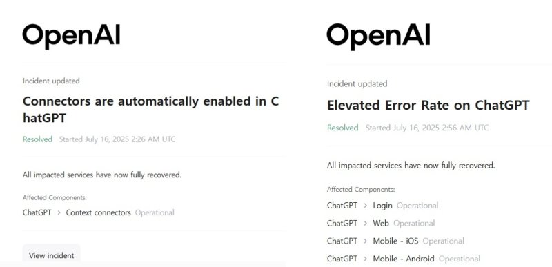 한편 오픈AI 서비스(챗GPT·소라·API 등)는 지난달 10일 오후 3시 36분부터 11일 오전 7시까지 사상 최장기간(약 15시간) 서비스 중단 현상을 겪은 바 있다. 회사는 당시 장애 원인으로 "시스템 업데이트 과정에서 다수 서버와의 연결이 일시적으로 끊어졌다"며 "가용 처리 용량이 감소하며 오류 등이 발생했다"고 설명했다.