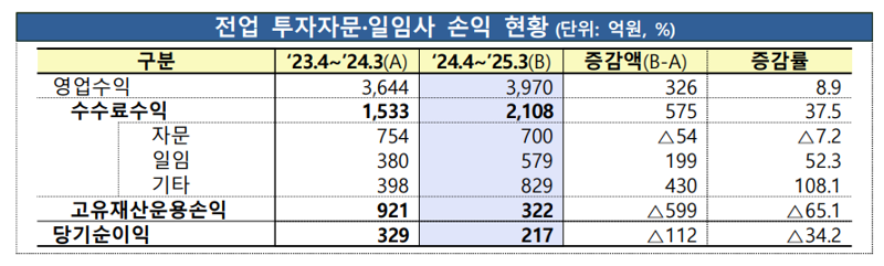 이는 제한된 시장 규모에 따른 경쟁 및 양극화가 심화된 영향으로 풀이된다. 금감원은 "전업 투자자문·일임사가 지속적으로 신규 진입하고 있지만, 지난해 주식시장 침체 등과 맞물려 흑자를 시현한 회사는 전년 대비 감소했다"고 밝혔다.