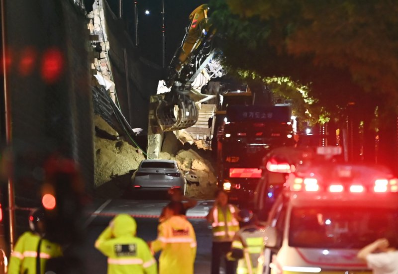 16일 경기도소방재난본부에 따르면 이날 오후 7시4분께 경기 오산시 가장교차로 고가도로 10m 높이의 옹벽이 무너져 차량이 매몰됐다는 신고가 접수됐다.