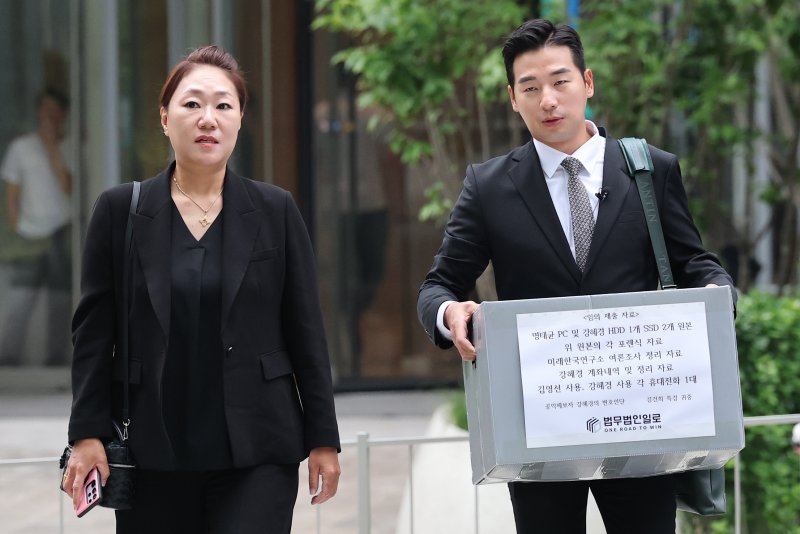 이날 강 씨는 명 씨의 PC, 자신이 소유한 하드디스크 드라이브(HDD) 1대 및 솔리드 스테이트 드라이브(SSD) 2대 원본과 원본의 각 포렌식 자료, 미래한국연구소 여론조사분석자료, 본인 계좌거래 내역 및 정리 자료, 2017~2021년 초까지 사용한 본인 휴대전화 1대, 2017~2023년 사용된 김 전 의원 휴대전화 1대 등을 임의 제출했다.