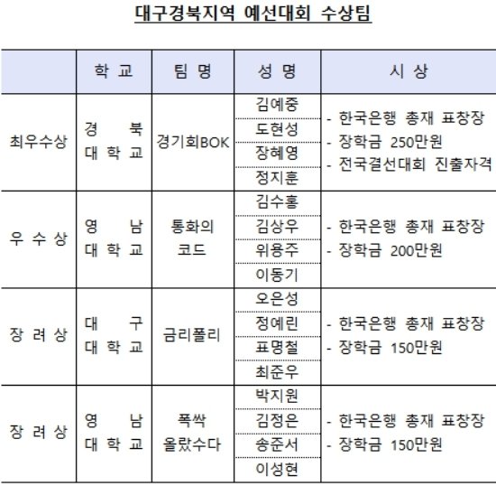 우수상은 영남대 '통화의 코드', 장려상은 대구대 '금리폴리'와 영남대 '폭싹 올랐수다' 팀이 각각 수상했다.