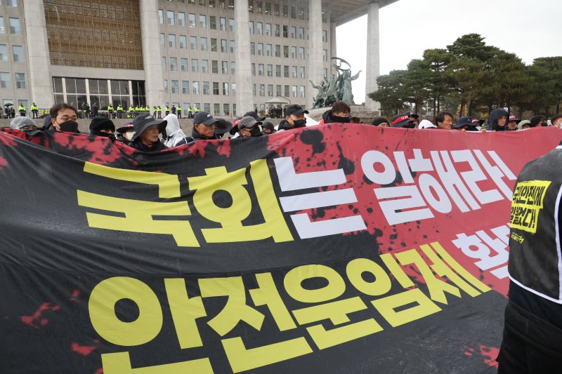 그러면서 "화주와 운송사들은 이미 3년 후 폐지될 제도라며 운임 인상 거부 움직임을 보이고 있다"며 "민주당은 약속을 저버렸고 국회는 노동자를 배제한 채 제도를 후퇴시켰다. 안전운임제를 온전하게 재도입하고 전면 확대하라"고 강조했다.