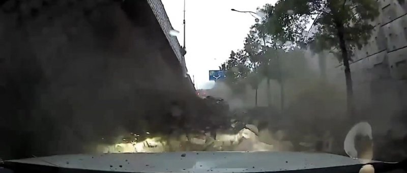 영상에는 둑방의 수문을 열면 가뒀던 물이 쏟아져 나오듯이 옹벽의 벽돌 등이 아래 도로로 터져 나오는 모습이 담겼다.
