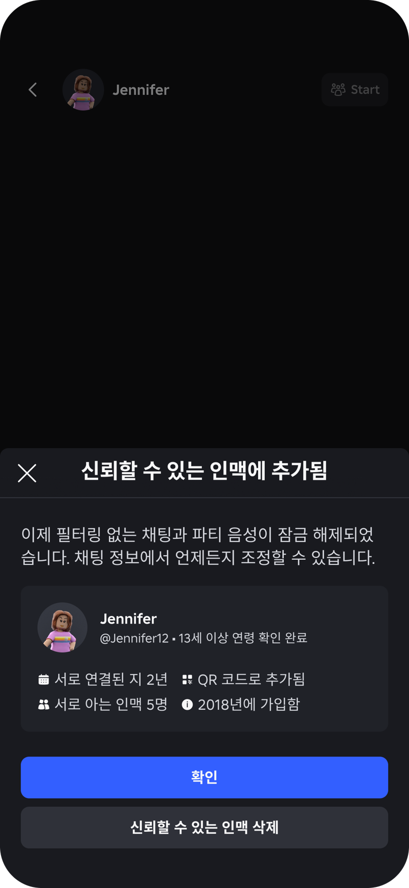 특히 '신뢰할 수 있는 인맥' 기능은 13세 이상 이용자가 연령 인증을 거친 뒤 현실에서 알고 있는 지인과만 QR코드 스캔이나 연락처 불러오기 등을 통해 연결할 수 있도록 설계됐다. 이를 통해 청소년 이용자가 모르는 성인 사용자와 쉽게 접촉하는 것을 차단했다. 로블록스는 신뢰할 수 있는 인맥 간의 대화를 포함한 모든 대화를 모니터링해, 그루밍과 같은 심각한 유해 행위를 방지하겠다는 계획이다.