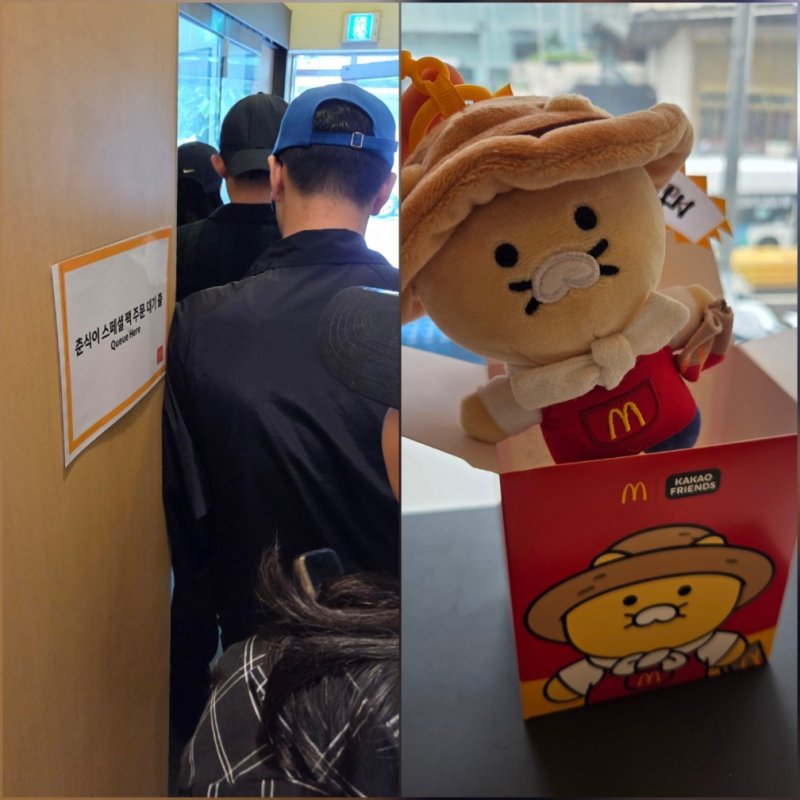 이날 오전 10시 맥도날드 영등포점에는 혼잡을 방지하기 위해 따로 마련된 '춘식이 스페셜 팩 주문 대기 줄'에 10여명이 넘게 줄을 섰다. 10시 30분부터 판매하는 '춘식이 인형 팩'을 구매하기 위해서다.