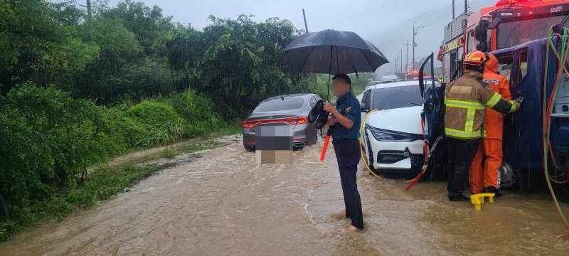 이날 오후 1시 오후 24분께 경북 청도군 청도읍 구미리에서 토사 유출로 도로와 차량이 침수됐다는 신고가 접수돼 소방당국이 조치 중이다.