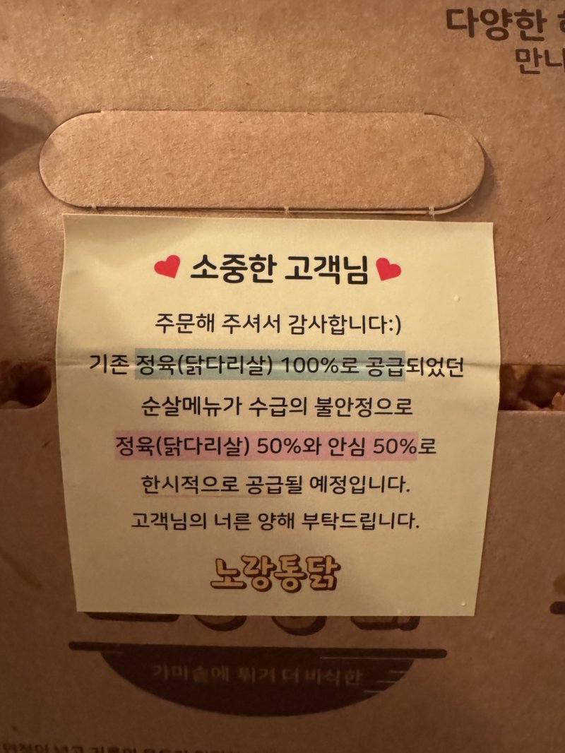 노랑통닭 측은 "브라질산 닭고기 수급 불안정에 따른 조치"라며 "8월 중 브라질산 수입이 재개되고 이후 수급이 안정되면 다시 닭다리살 100%로 전환할 계획"이라고 밝혔다.