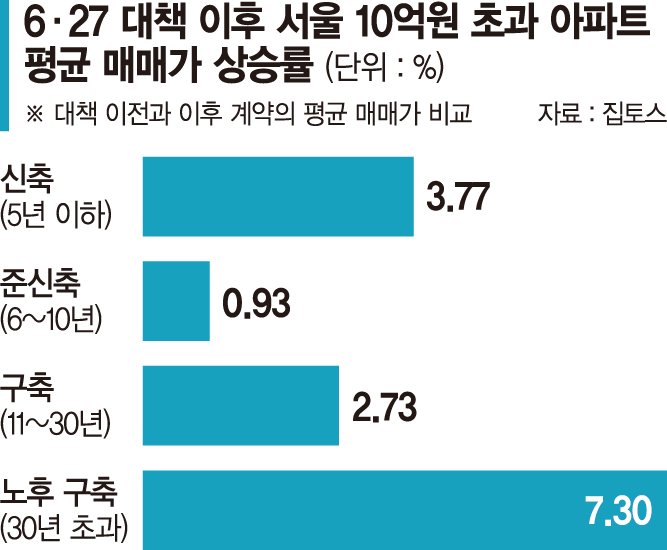 서울 집값 상승은 30년이 넘은 노후 아파트가 견인했다. 준공 30년 초과 단지는 대책 이후 7.3%나 급등하면서 신축(3.8%)의 상승률을 크게 웃돌았다.