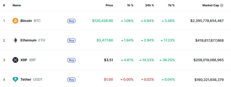 리플이 랠리하자 다른 주요 암호화폐도 일제히 상승하고 있다. 시총 1위 비트코인은 0.84% 상승한 12만428달러를 기록하고 있다.