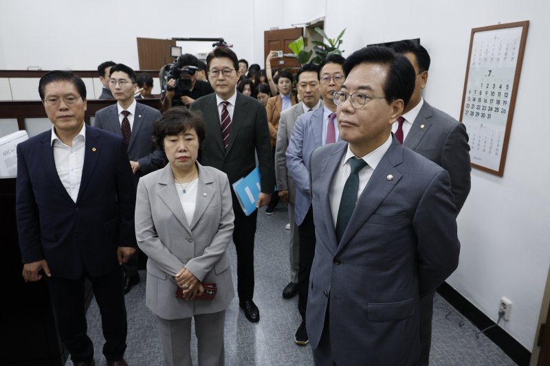 [파이낸셜뉴스] 국민의힘 지도부와 국회 법제사법위원회 소속 의원들 18일 우원식 국회의장을 찾아 '국회 경내 압수수색에 신중해야 한다'는 대국민 메시지를 내줄 것을 촉구했다. 이날 특검은 권성동·이철규 의원의 자택과 의원실 등을 동시에 압수수색하며 국민의힘 의원을 향한 수사 폭을 넓혔다.