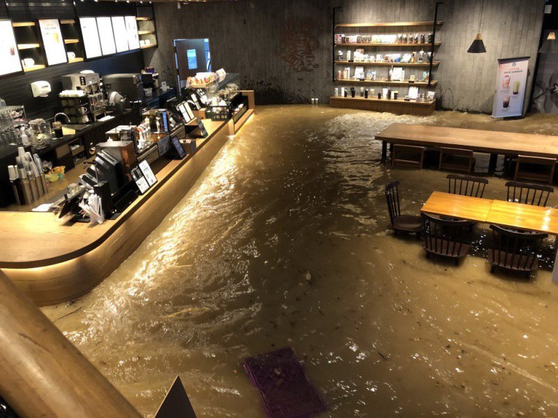 매장 외부 모습도 심각하다. 스타벅스 앞 도로는 흙탕물로 가득 찼고, 주변 상가와 차들도 물에 잠긴 모습이다. '드라이브 스루'라고 적힌 매장 간판은 윗부분만 겨우 보일 정도였다.