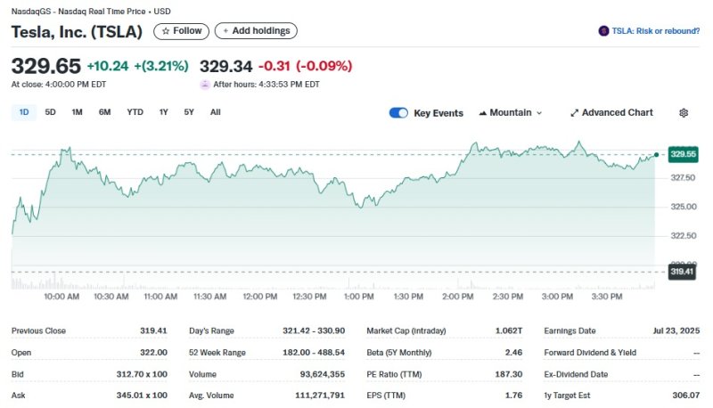 18일(현지시간) 뉴욕증시에서 테슬라는 3.21% 급등한 329.65달러를 기록했다. 이로써 시총도 1조620억달러로 불었다.