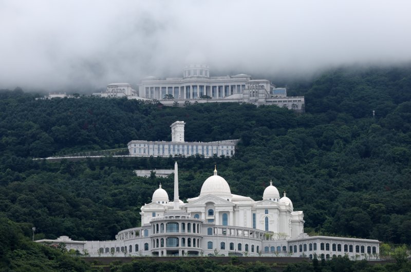 [가평=뉴시스] 배훈식 기자 = 김건희 여사 의혹을 수사하는 민중기 특별검사팀이 통일교 압수수색에 들어간 18일 오후 경기 가평군 통일교 천원궁(아래부터), 천승전, 천정궁박물관 모습. 2025.07.18. dahora83@newsis.com ◆서울중앙지법 들어서는 윤석열 전 대통령 탑승 차량