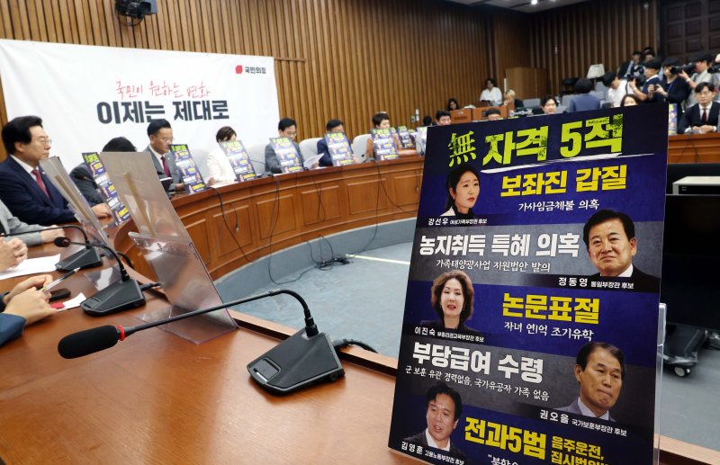 [서울=뉴시스] 이승재 기자 = 국민의힘은 19일 이진숙 교육부 장관 후보자와 강선우 여성가족부 장관 후보자 임명을 반대하면서 "이재명 대통령은 지금이라도 인사 실패를 솔직히 인정하고 후보자를 원점 재검토하는 것이 국민에 대한 도리이자 겸손한 자세임을 명심하기 바란다"고 밝혔다.