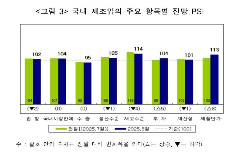 세부 지표로는 내수(104), 수출(95)이 전달과 같은 수준을 유지했고, 투자액(99→104), 제품단가(105→113)는 전달보다 올랐다.