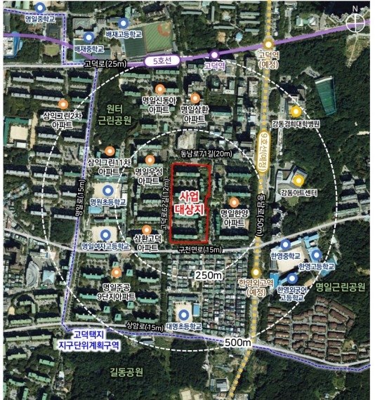 5호선 고덕역 인근에 있는 대상지는 동측 상업지역 학원가, 서측 원터근린공원으로의 접근성이 좋으며, 명일근린공원, 강동아트센터, 강동경희대병원 등 주변 인프라도 풍부하다.