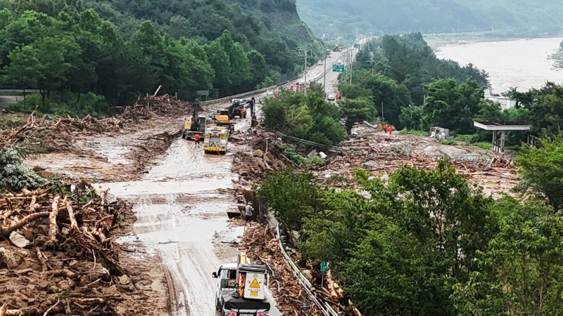 [산청=뉴시스] 차용현 기자 = 20일 오전 경남 산청군을 가로지르는 산청대로에 지난 19일 폭우로 산사태가 발생하자 관계자들이 복구작업을 펼치고 있다. 2025.07.20.con@newsis.com [서울=뉴시스]고범준 차용현 조재완 기자 = 김민석 국무총리가 20일 집중호우 피해가 발생한 경남 산청에 송미령 농림축산식품부 장관을 급파했다.