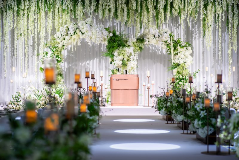믹스 플라워 웨딩은 생화와 조화를 조화롭게 구성한 풍성한 스타일링이 특징이다. 천고 6m의 웅장한 공간에 행잉 장식, 무대, 입구, 버진로드, 센터피스, 포토테이블 등 주요 공간 전체를 아우르는 플라워 데코레이션이 더해진다.