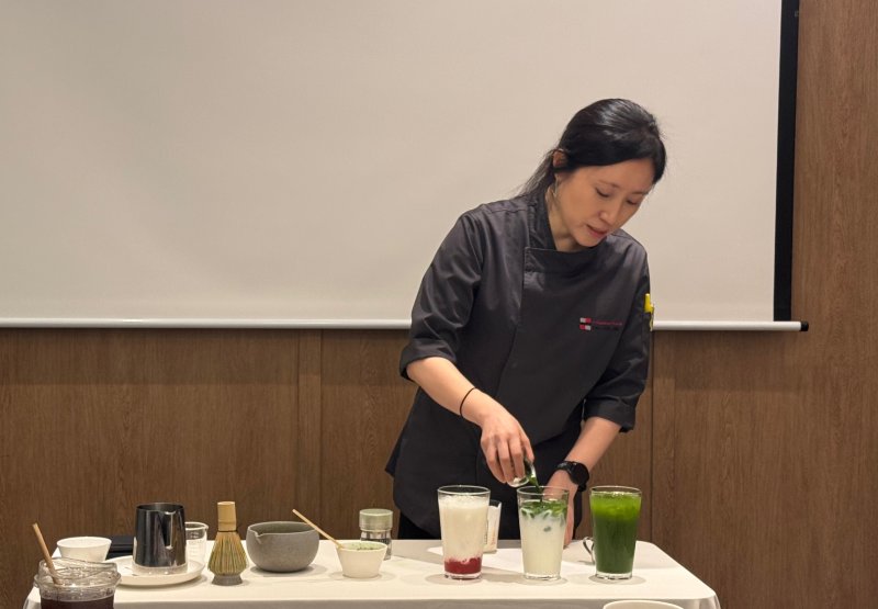 김현정 투썸플레이스 연구개발팀 커피·음료 담당은 설명회 현장에서 전통 다도 도구를 활용해 말차 제조 시연을 선보였다. 대나무 거품기(차선)를 이용해 말차 분말에 70~80도의 온수를 부은 뒤 'M자' 형태로 빠르게 저어 거품층을 형성하는 '격불' 과정을 직접 시연하며 "제주 해양성 기후에서 자란 말차 특유의 감칠맛과 선명한 녹색이 특징"이라고 설명했다.