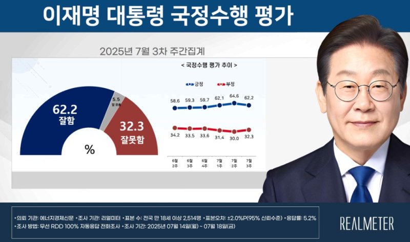 21일 공개된 에너지경제신문 의뢰 리얼미터 여론조사 결과, 이 대통령 국정수행 긍정평가는 62.2%로 전주보다 2.4%포인트 내렸다.