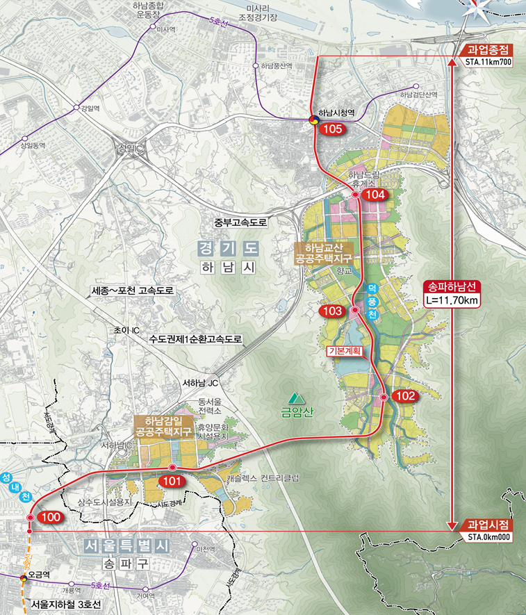 송파하남선의 총 길이는 11.7km로, 현재 운행되고 있는 서울 지하철 3호선 대화~오금 구간을 하남시청역(서울 5호선 환승)까지 연장하는 광역철도 노선이다. 서울시 송파구 방이동 1곳과 경기도 하남시 감일·교산지구 5곳 등 총 6곳에 정거장이 건설되고, 기존 3호선과 같은 종류의 전동차가 운행될 예정이다.