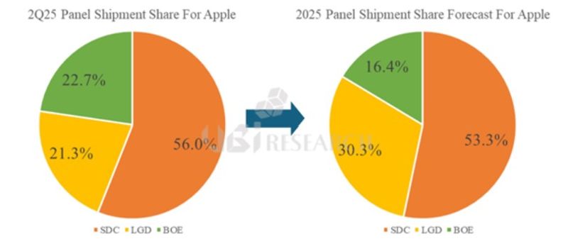 2·4분기 LG디스플레이의 아이폰용 패널 출하 비중은 21.3%로, 중국 BOE(22.7%)에 처음으로 밀렸다. 삼성디스플레이는 56.0%의 점유율을 차지했다.